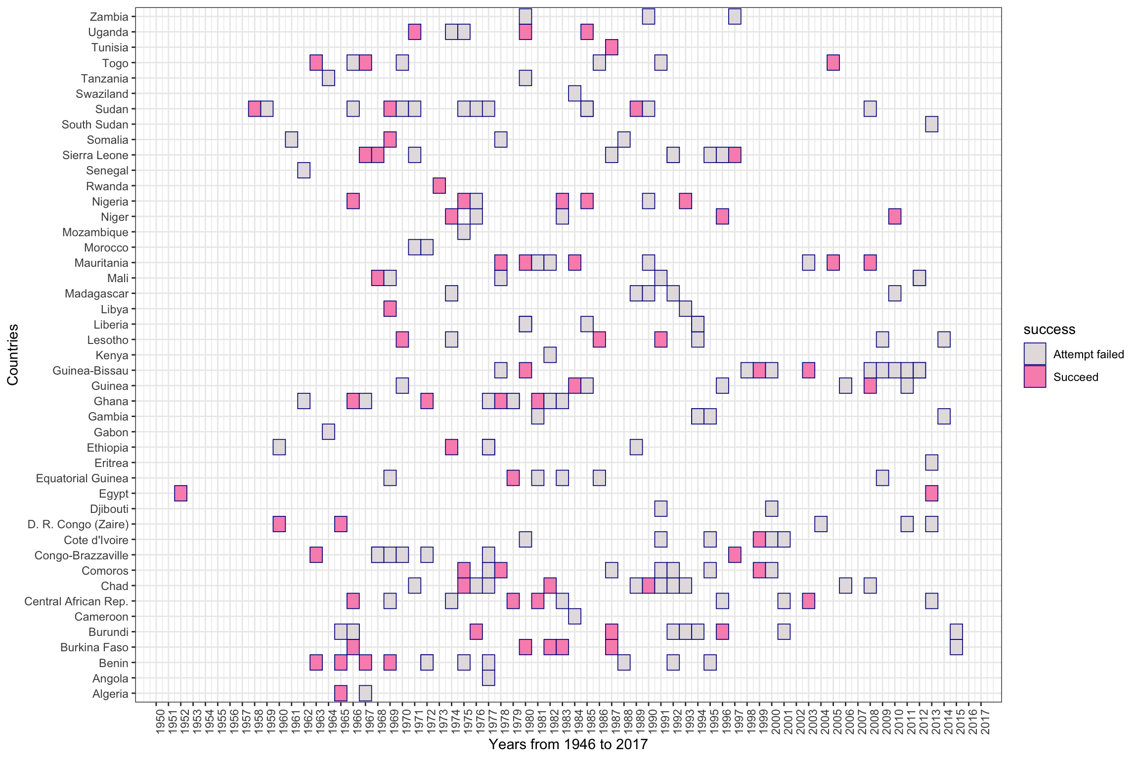 This first post will be a little political. As I read on BBC last Monday about an attempt coup in Gabon which has not succeed, I came up with the same question as the website: Is Africa seeing fewer military takeover attempts? In the BBC’s article, they use data from researchers of University of Central Florida to give at glance the answer to the question. Which end up to be yes. I wanted to reproduce the same type of analysis to have an idea of what has been in Africa these recent years, using data from Center for Systemic Peace1 on coups d’Etats, since 2017. I use a descriptive approach in this analysis.