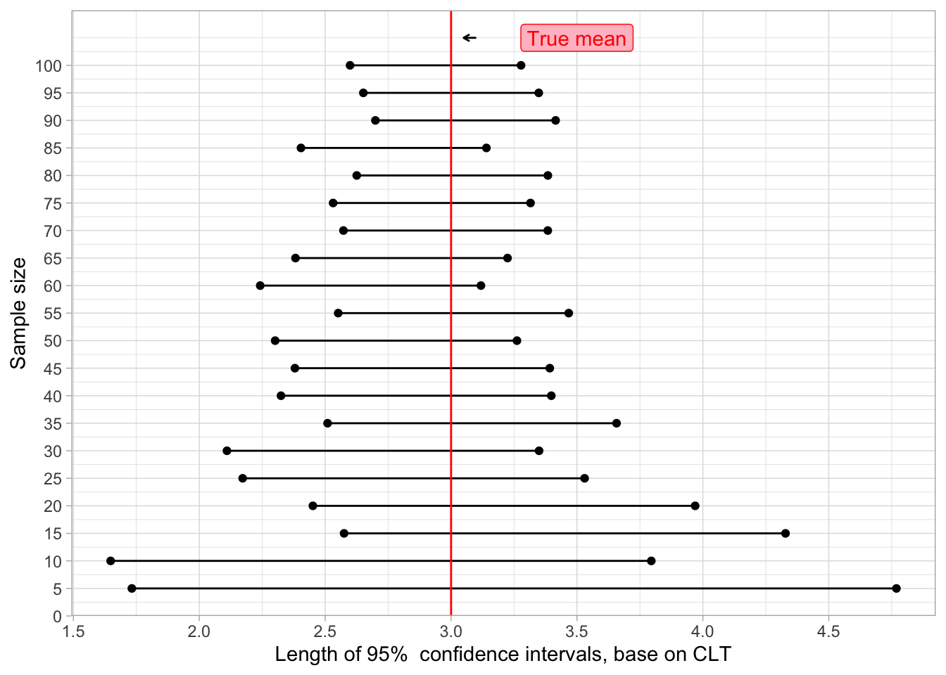 labs(x = "Length of confidence intervals, base on CLT", y = "Sample size")