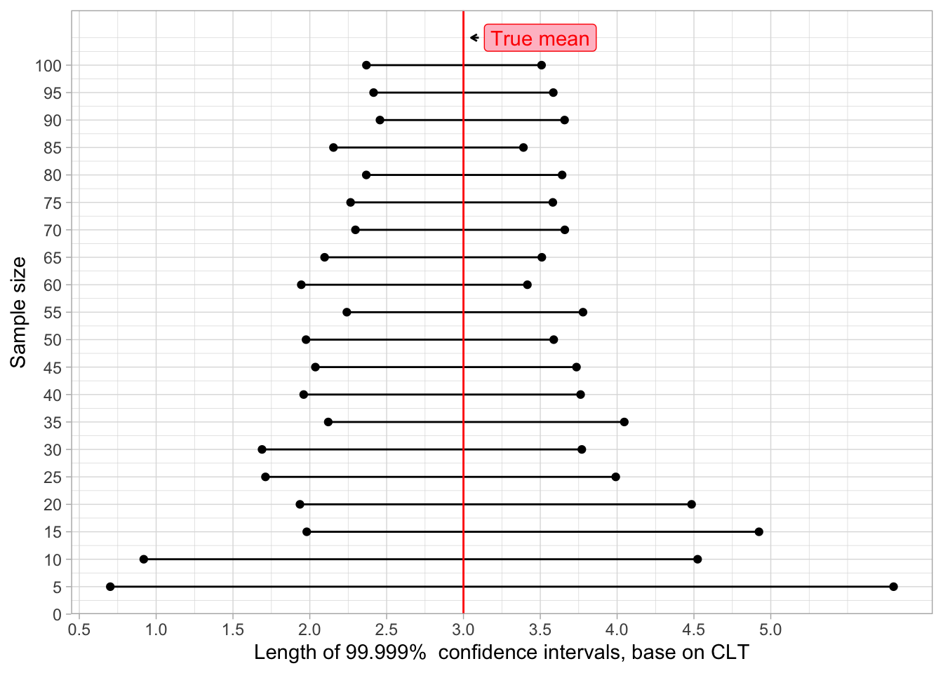 x = "Length of 99.999% confidence intervals, base on CLT",
